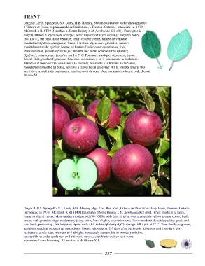 use: fresh, processing, fair for juice; ripens early Oct. in Frelighsburg (QC); storage: till April at 2° C. Tree: hardy, vigorous,