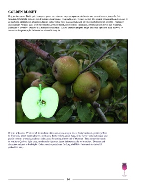 de pectines, aromatique; utilisation finale: cidre, bonne pour la consommation en frais; maturation: fin octobre. Pommier: