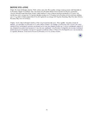 Origine : Sainte-Anne-de-Beaupré (Québec). Fruit : de grosseur moyenne; peau : bleue; qualité : moyenne; époque de