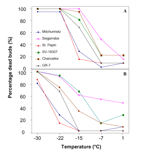 températures de congélation sur la mortalité des bourgeons primaires des cultivars de
