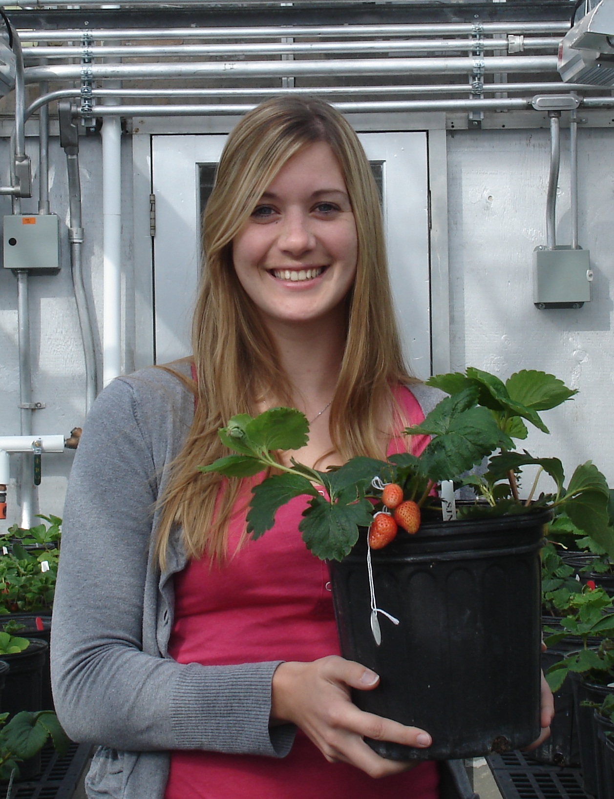 participates in breeding of strawberries in greenhouse.